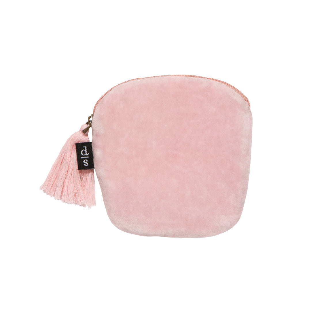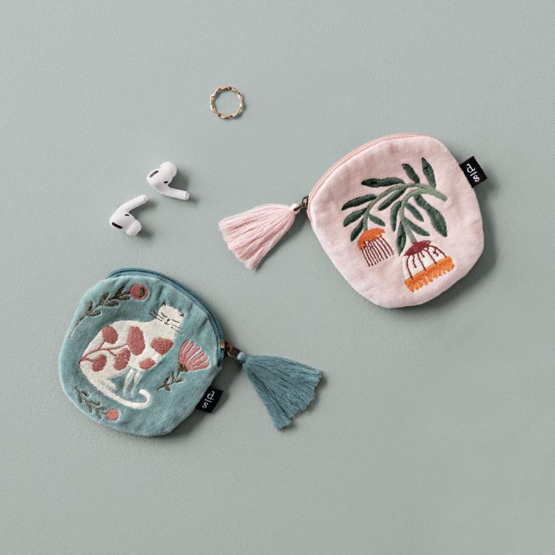 Pochette ronde brodée, en velours de coton, avec pompon à la fermeture éclair. Compacte et parfaite pour transporter tes petits objets essentiels.