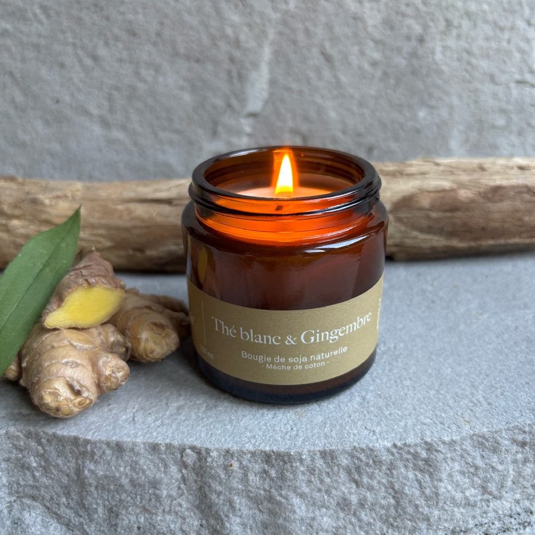 La bougie Thé blanc & Gingembre vous offre une fragrance à la fois délicate et revigorante. Cette composition harmonieuse mêle la douceur subtile du thé blanc à la fraîcheur épicée et tonique du gingembre, créant une ambiance apaisante et énergisante à la fois.