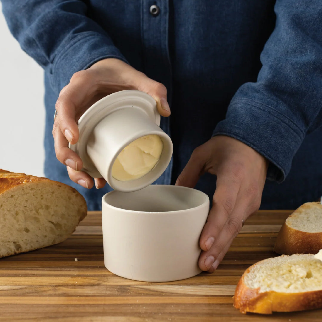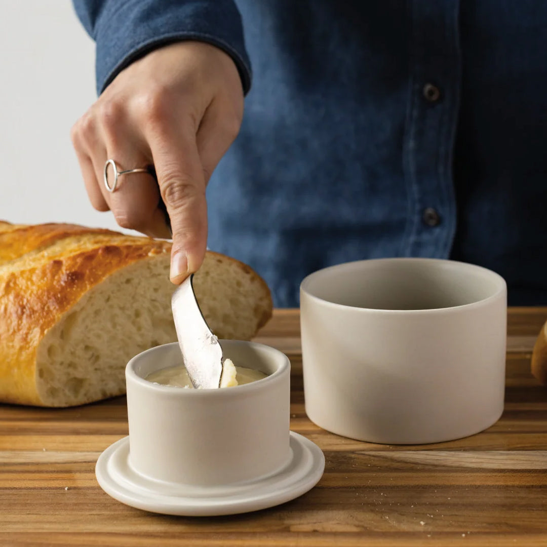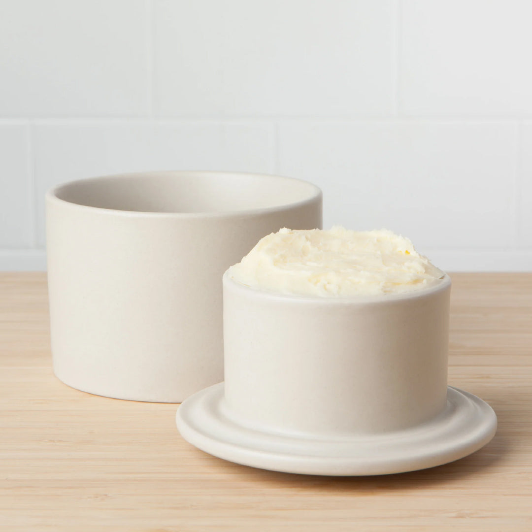 Beurrier traditionnel au charme rustique français utilisant une méthode de conservation éprouvée depuis le XIXe siècle pour garder le beurre frais et onctueux, jamais dur.