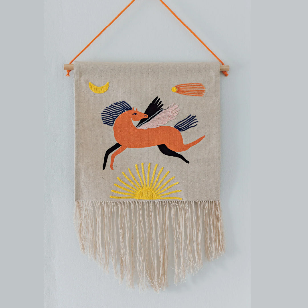 Charme boho et chaleur instantanée avec cette décoration murale franges aux tons naturels.