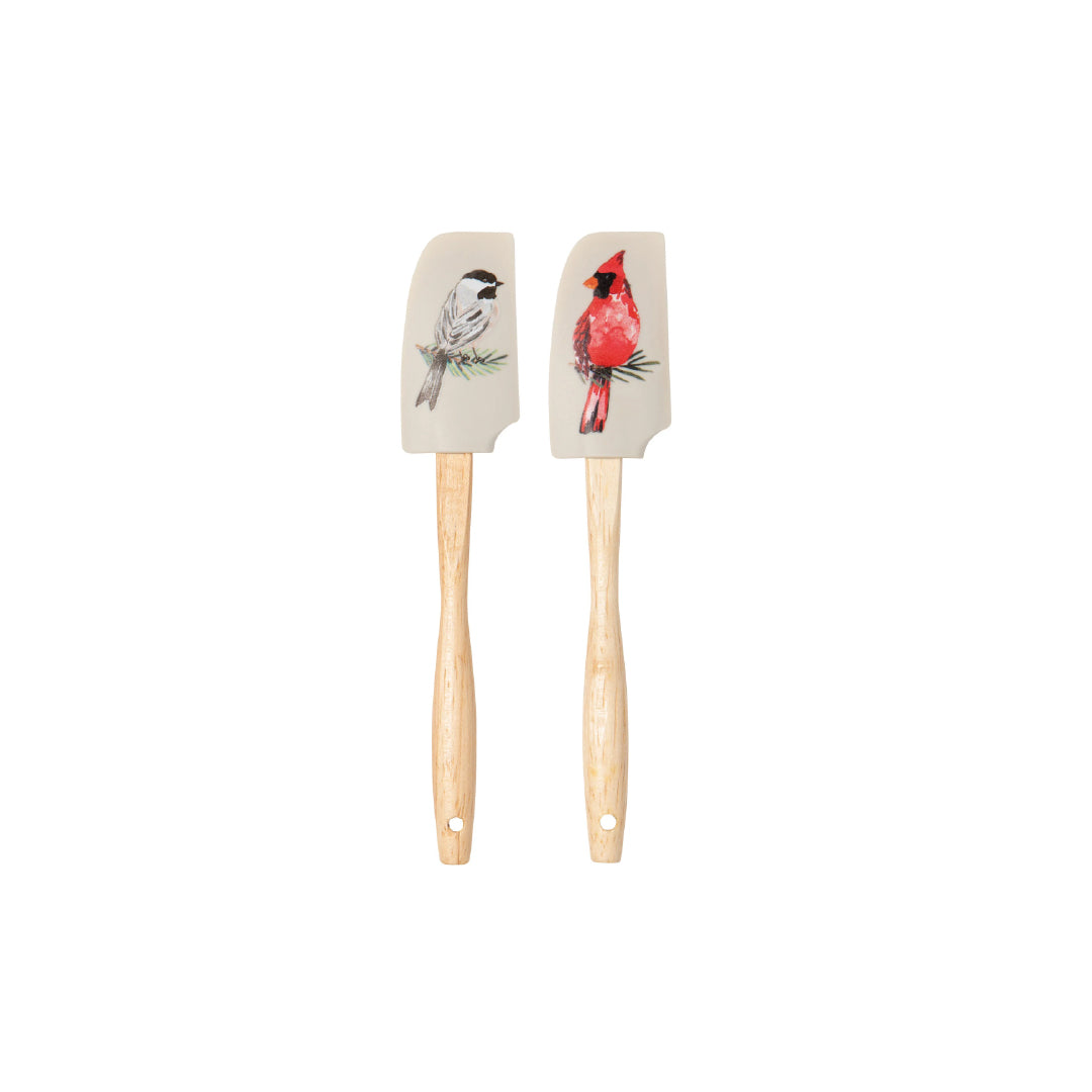 Ensemble de 2 mini maryses illustrées d'une mésange et d'un cardinal. Manche de bois massif et tête de silicone qui résiste à la chaleur et se retire pour un nettoyage facile. Trop mignonnes et pratiques comme tout pour glacer des cupcakes!!